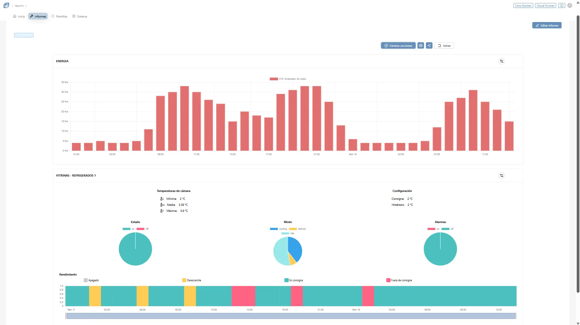 Un ejemplo muy típico lo encontramos en supermercados. Imagina una instalación con 2 cámaras frigoríficas y 7 muebles de refrigeración. Si varios equipos entran en desescarche al mismo tiempo, ese “evento” se refleja directamente en la gráfica como un pico de consumo bastante evidente, que incluso puede acercarse a la potencia máxima contratada. Lo interesante no es solo verlo, sino entenderlo, saber qué equipos están implicados, comprobar si alguno está consumiendo más de lo normal durante ese proceso y, en muchos casos, detectar problemas antes de que vayan a más.