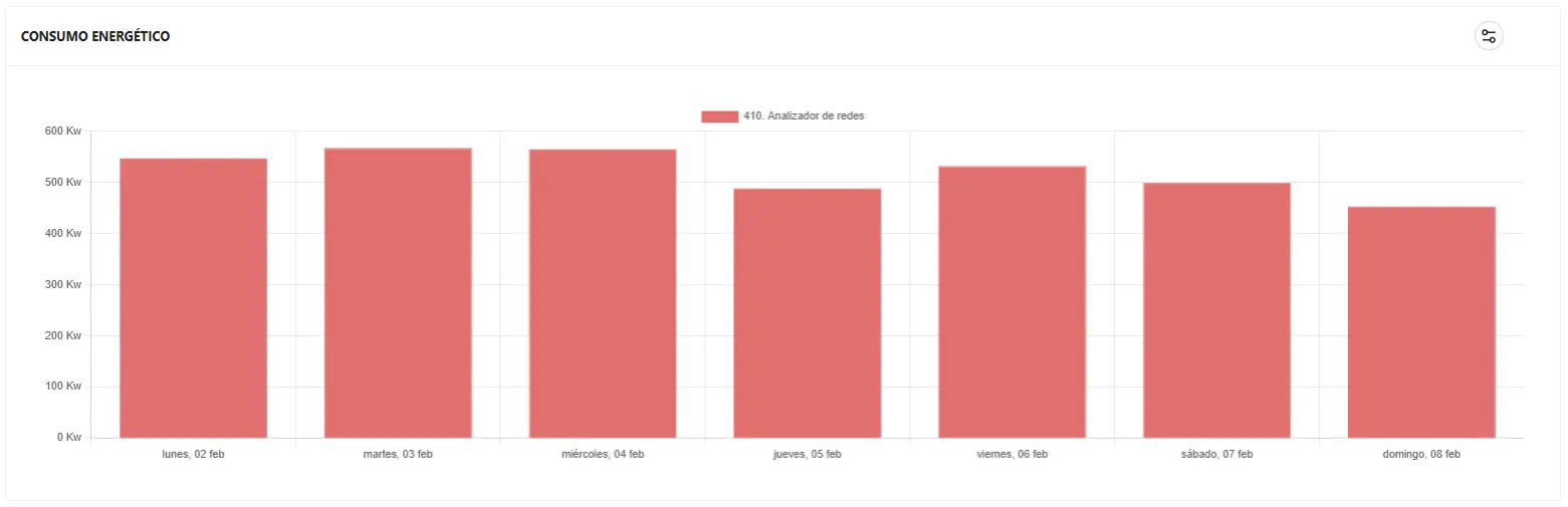 De igual forma, podemos configurar la gráfica para visualizar las medias. En este ejemplo se ha realizado el análisis por día, mostrándonos cuando tenemos el mayor consumo energético. Si nuestra instalación no tiene actividad los domingos y vemos que sigue teniendo un consumo parecido a cualquier otro día de la semana, es probable que algo nos esté haciendo un consumo innecesario.
