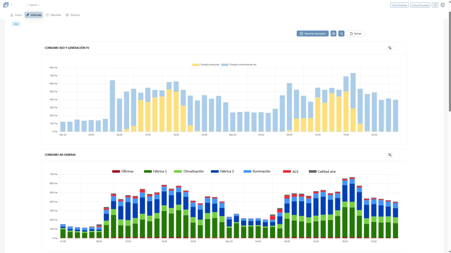 Por otro lado, al cruzar estos datos con el submetering, es posible identificar a que zona o división se deben los consumos elevados, en el ejemplo podemos ver que el 2 de Marzo hay un pico de consumo fuera del apoyo fotovoltaico, que coincide con un mayor consumo de Fábrica 1, en verde oscuro. Se podría plantear, como decisión estratégica inteligente, desplazar temporalmente ese consumo elevado a cuando la instalación fotovoltaica esté generando energía y así amortiguar el coste.