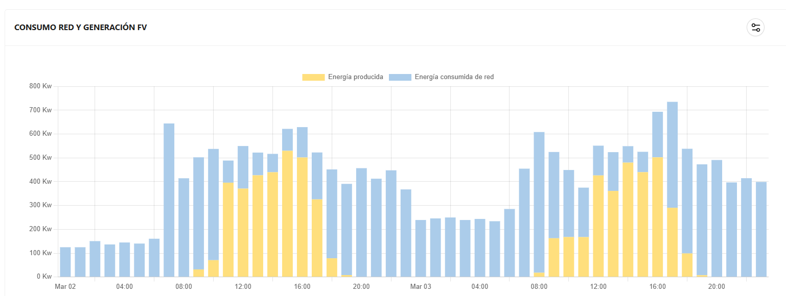 Podemos visualizar en una misma gráfica el consumo energético de la instalación junto con la generación de energía de un sistema fotovoltaico. De un solo vistazo es posible entender cómo se comporta el sistema: en qué momento del día comienzan a producir nuestras placas solares, cuándo se producen los picos más altos de consumo o cuál es el consumo residual cuando la actividad de la instalación es mínima.